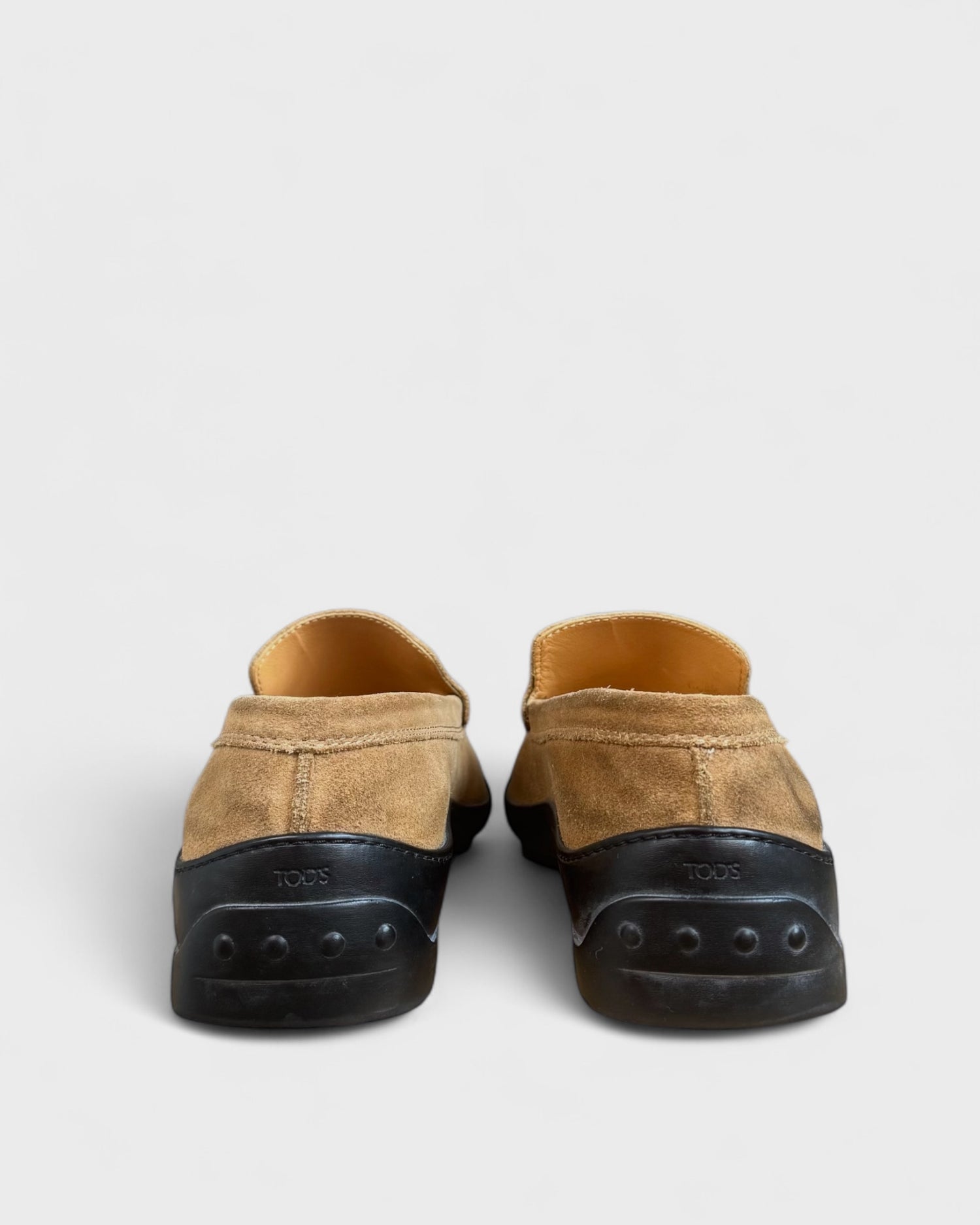 Mocassins en daim beige de la marque Tod's, au style classique et élégant. Semelle en gomme noire avec renforts à picots signature à l’arrière. Confection haut de gamme, intérieur cuir et belle finition cousue main. Portés mais en bon état général. Un modèle intemporel, parfait pour un look chic et décontracté.